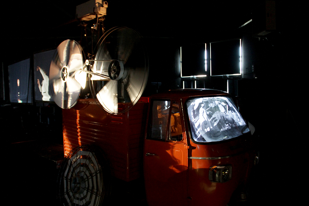 Le public est convié à une projection de cinéma itinérant. Un écran au format panoramique est tendu.