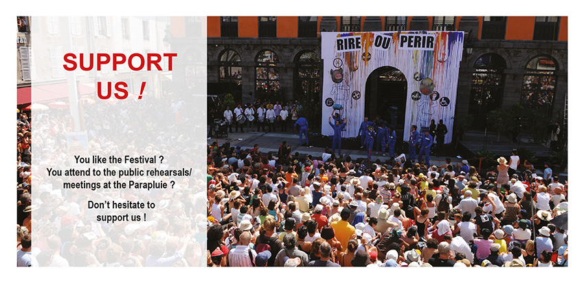 Throughout the year the association welcomes artists, either on residency at the “Parapluie”, or as a part of “Champ libre” or the Festival of Aurillac programme. Do you like the festival ? Do you attend public rehearsals/meetings at the "Parapluie" ? Please feel free to support us !